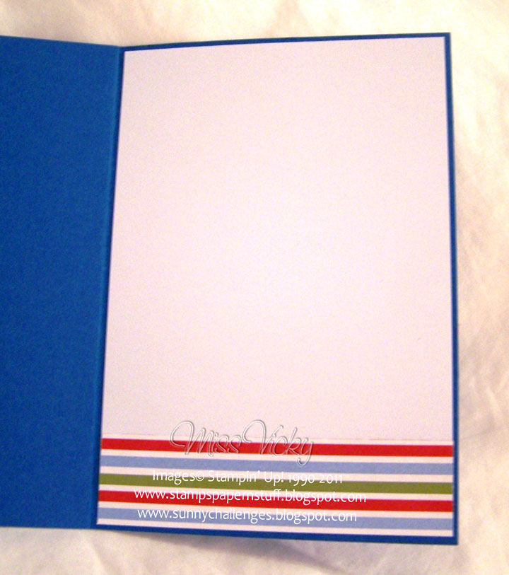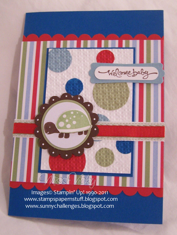 I run a piece of Pear Pizzazz Ribbon across the card, followed by a piece of Real Red to the centre of the Pear Pizzazz. I stamped the turtle image onto a scrap piece of Whisper White Cardstock & punched using my Circle Punch, adhered to a punched piece of Baja Breeze, then to the Scalloped Circle of Chocolate Chip & finally over the top of the ribbons. I stamped another image using Pear Pizzaz, cut his shell out & applied to the brown image using SU Dimensionals.