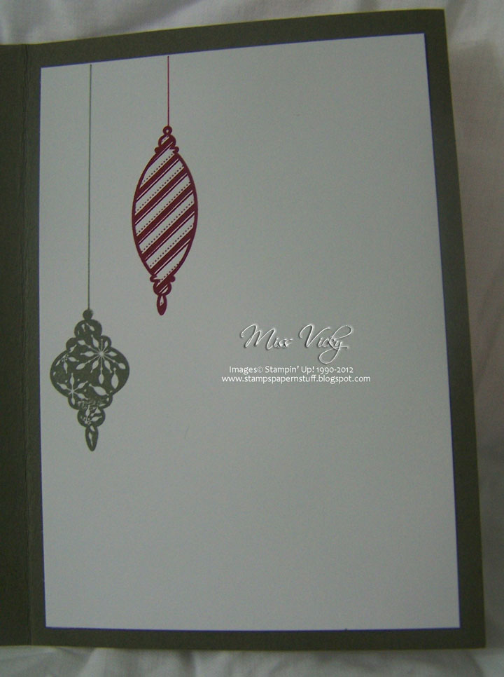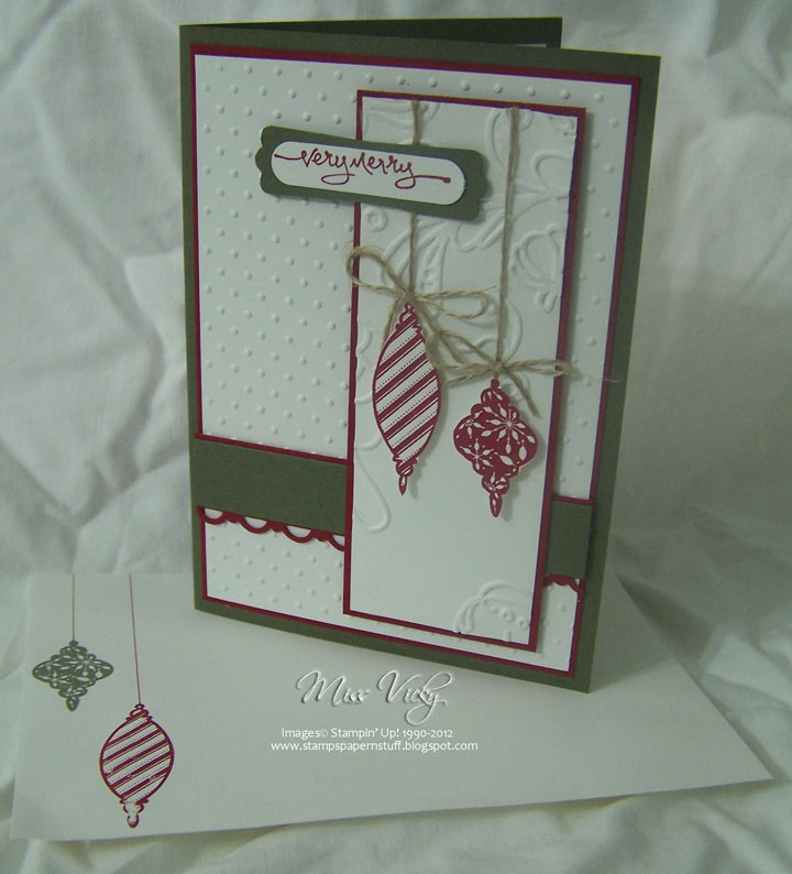 Vicky, this is beautiful. I love the Elegant Lines embossing behind the popped-up ornaments; it makes for a really beautiful focal panel. I really like the colours you've used, too. Gorgeous Christmas card!