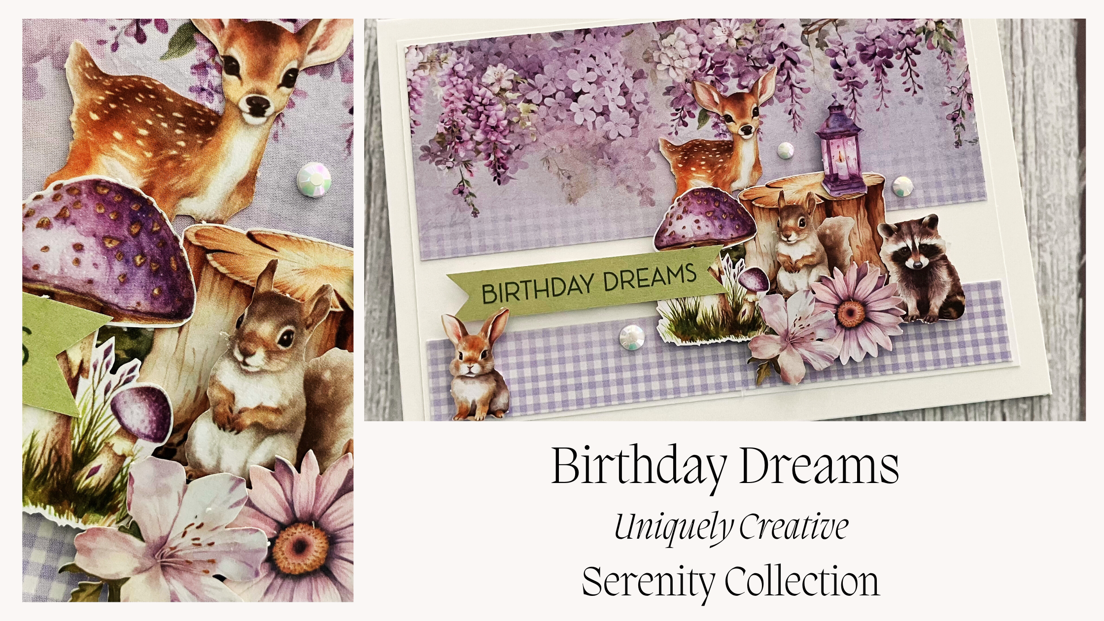 The card has been created with Uniquely Creative’s latest Collection – Serenity. It is full of lovely soft purples & greens with lots of flowers, forest animals, faires, butterflies & dragonflies. Simply gorgeous.